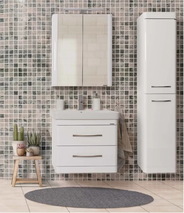 Luxor kolekcija kupatilskog nameštaja prepoznatljiva je po modernom dizajnu sa čistim linijama i elegantnom završnom obradom. Bela površina visokog sjaja daje prostoru osećaj čistoće i svetline, dok metalne ručke dodatno naglašavaju savremen izgled ormarića.