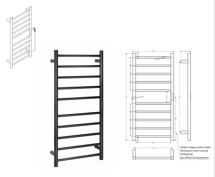 Ovaj sušač izrađen je od nerđajućeg čelika, koji pruža maksimalnu otpornost na vlagu i dugotrajnost. Površina sa crnom završnom obradom pruža luksuzan izgled i lako se kombinuje sa tamnim sanitarijama, mat crnim armaturama ili zlatnim akcentima. Završna obrada otporna je na ogrebotine i vlagu, što garantuje dug vek trajanja i postojan izgled čak i nakon godina svakodnevne upotrebe.