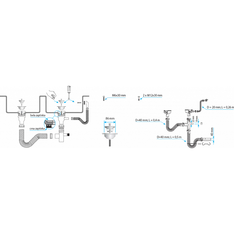 - Omogućava sigurno i efikasno odvođenje vode iz obe posude sudopere